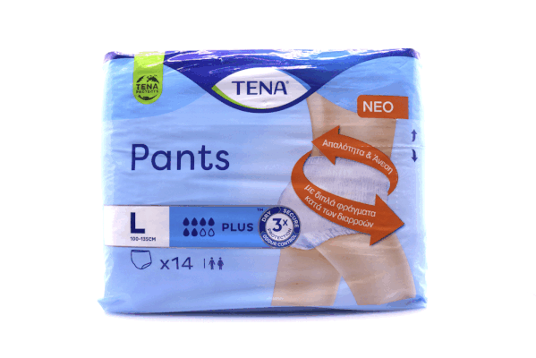Τα TENA Pants Plus είναι λευκά, απαλά και άνετα εσώρουχα μίας χρήσης για άνδρες και γυναίκες που τα φοράτε τραβώντας τα προς τα επάνω, ακριβώς όπως τα κανονικά εσώρουχα. Με εφαρμοστή και υφασμάτινη υφή, φτιαγμένα από υλικά που αναπνέουν, είναι σχεδιασμένα για απαλή άνεση. Σε αντίθεση με τις κλασικές πάνες ενηλίκων, οι ΤENA Pants Plus διαθέτουν έναν υψηλά απορροφητικό πυρήνα ο οποίος κλειδώνει την υγρασία γρήγορα και αποτελεσματικά για απόλυτη ασφάλεια.